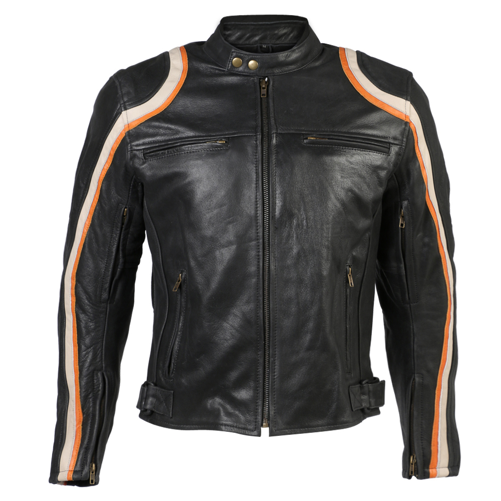 Contrasting distressed leather stripes on sleeves and shoulders that also act as a high-visibility