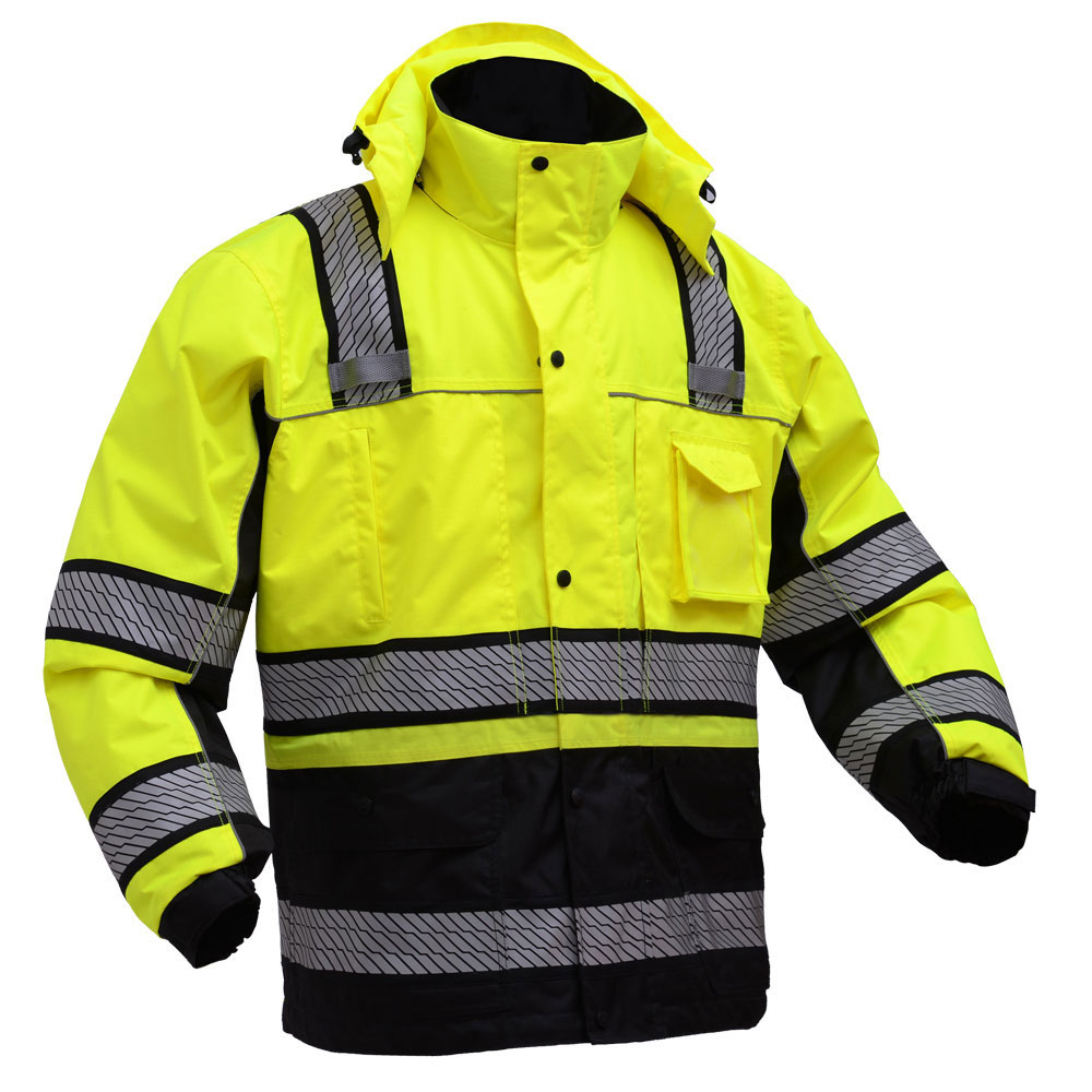 Outer shell with thermal insulation with removable zip up sweatshirt, segment reflective bands on both arms.